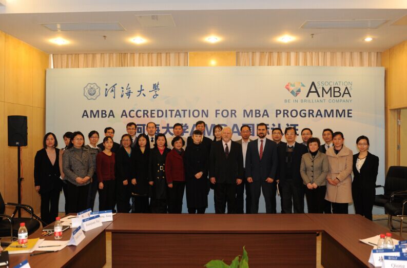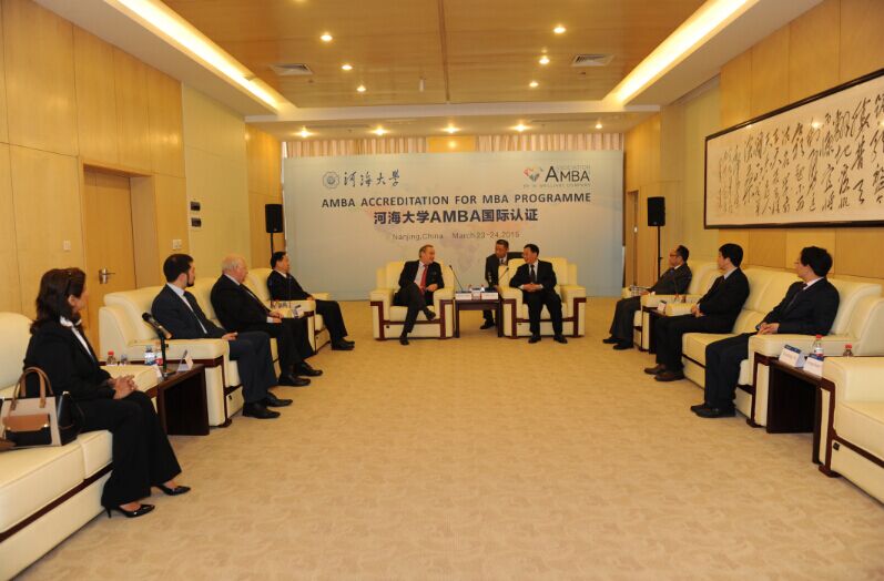 The business education in Hohai University started international accreditation work in 2010, including AMBA, AACSB, EQUIS, PMI and so on. WANG Zhongming, AMBA International Accreditation Specialist and head of AMBA Association in China, respectively visited HHBS and gave much guidance in April, 2012 and Jan, 2014. In Jan, 2015, HHBS was pre-authenticated by AMBA Association. On May, 23rd, and 24th, 2015, AMBA panel conducted site evaluation on HHBS. Panel member includes Prof. Martyn Jones, Chair of AMBA Quality Committee, Prof. Mark Oakley, Academic Consultant of AMBA Association, WANG Zhongming, Head of AMBA Association in China, and Mr. George Iliev, Director of New Market Development. XU Hui, President of Hohai University, JU Ping, Vice President of Hohai University, met AMBA panel in HHBS. After site evaluation, International Accreditation Advisory Board discussed and agreed that MBA program of Hohai University is officially accredited by AMBA Association.